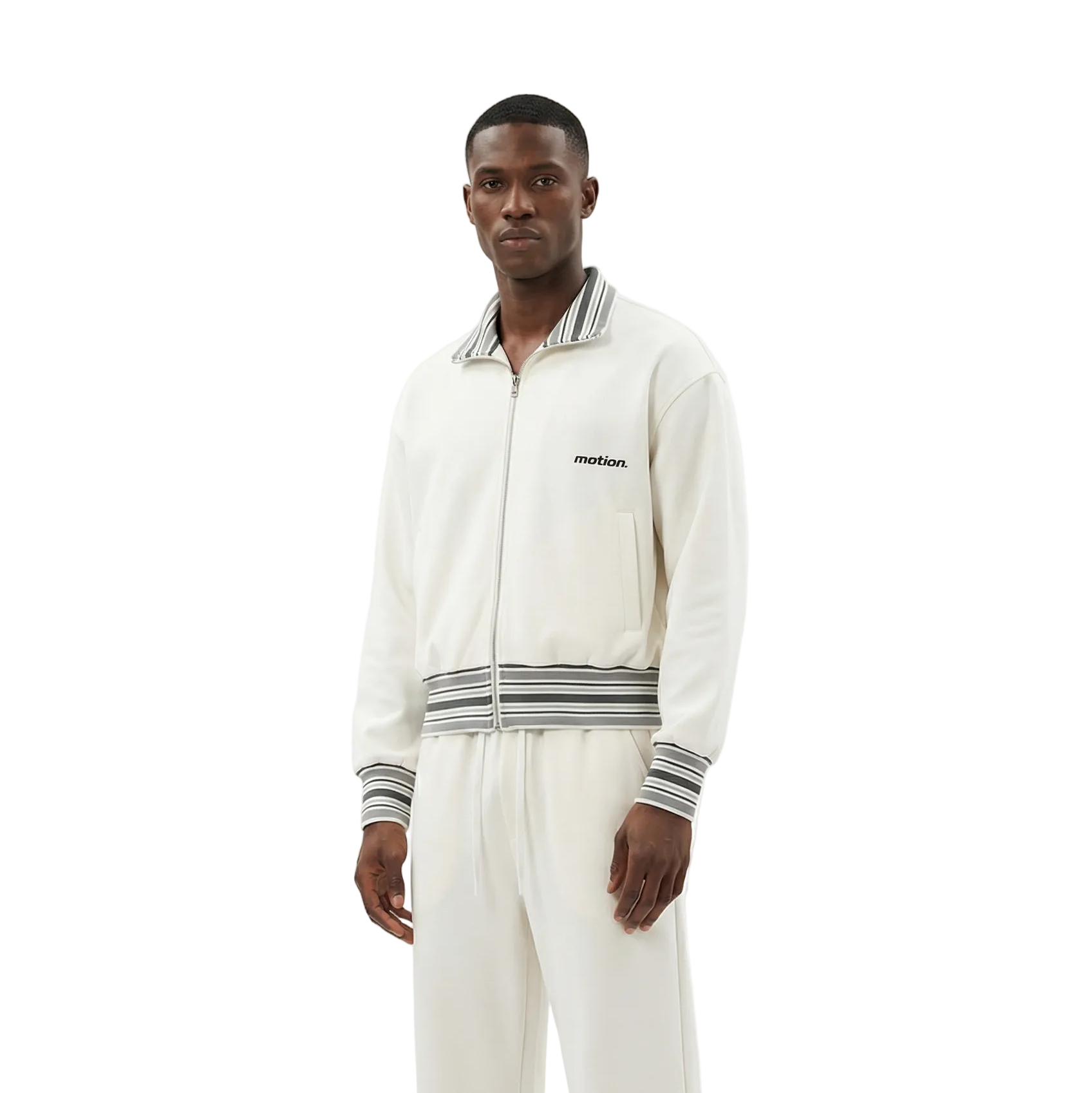 Black wide-leg track pants. White drawstring, contrast arch stitch on the front panel. Relaxed fit, elastic waist, heavyweight. Designed to sit with the hoodie, works just as well alone.